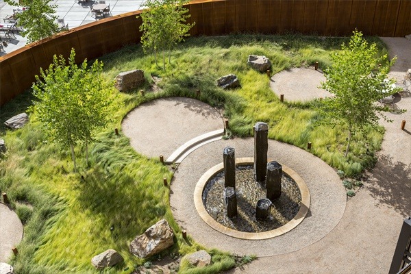 The courtyard is the heart of the property. Sitting areas are sprinkled like raindrops across a mound of soft native grasses that flow between native cottonwood trees. A tall curved corten wall encloses the space and amplifies the sound of water falling in the circular pool.